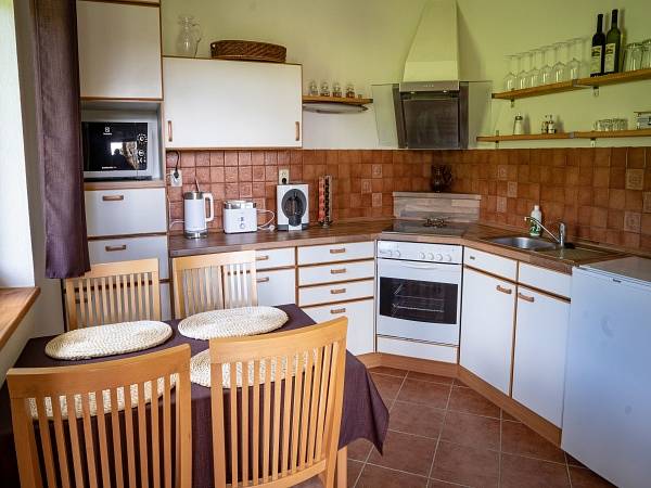 V přízemí chaloupky je plně zařízená kuchyně (mikrovlnná trouba, rychlovarná konvice, topinkovač, kávovar, sporák, trouba, lednice), s jídelním stolem, která je propojena s obývacím pokojem. V obývacím pokoji je rozkládací pohovka, na které se pohodlně vyspí dva lidé, krbová kamna a TV.